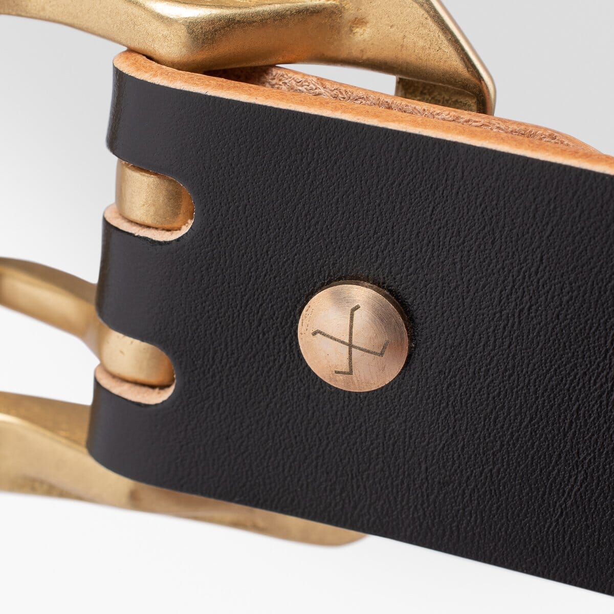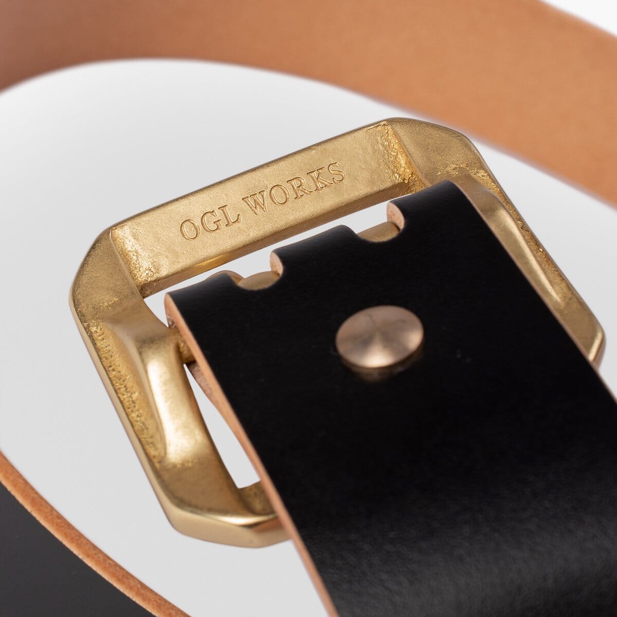 Black hand-dyed leather belt with ellipse punch holes and solid brass garrison buckle with double prong. Handmade by Obbi Good Label in Singapore. Constructed with 12oz cowhide leather which will age naturally with unique characteristics.