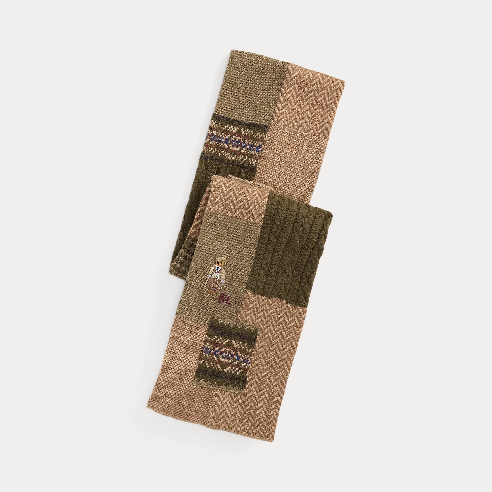 This wool-blend scarf is constructed in a patchwork of contrasting textures and patterns, including herringbone, cable knit, and Fair Isle. It is detailed with embroidery of the Polo Bear and our founder’s initials chain-stitched at one end.