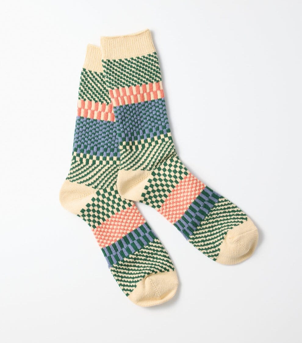 A combination of plaids and ladder-like patterns gives a vibrant vibe to these Jacquard socks. The design is inspired by the mid-century styles, while the colors are modeled after the ones of works of the day that faded over time.