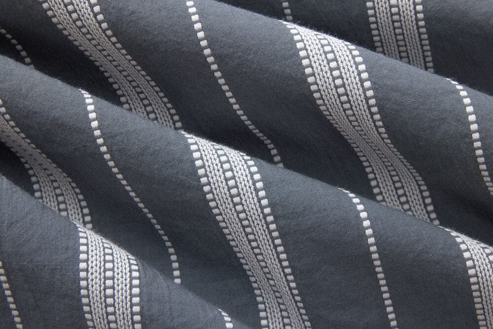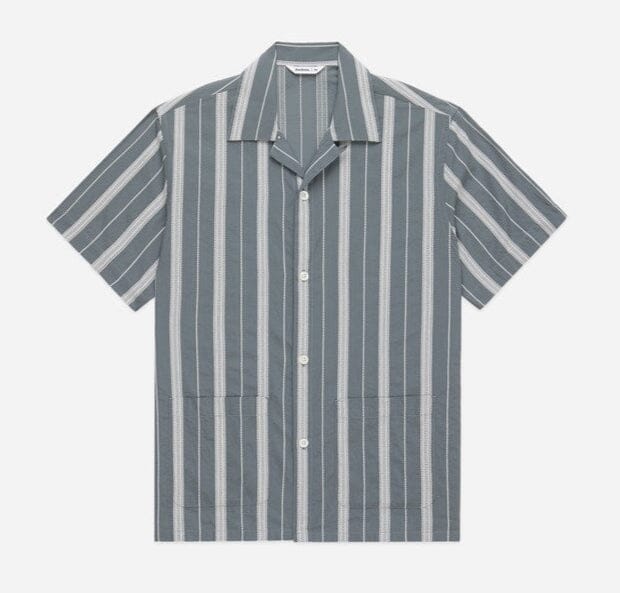 The Cabana Shirt is a riff of a guayabera shirt. It features an open collar with loop closure, lower hip pockets, and a generous fit. For SS25, we've employed a cotton poplin fabric with a ticking strip detail woven in. Mother of pearl buttons finish it off. Made in Portugal.