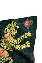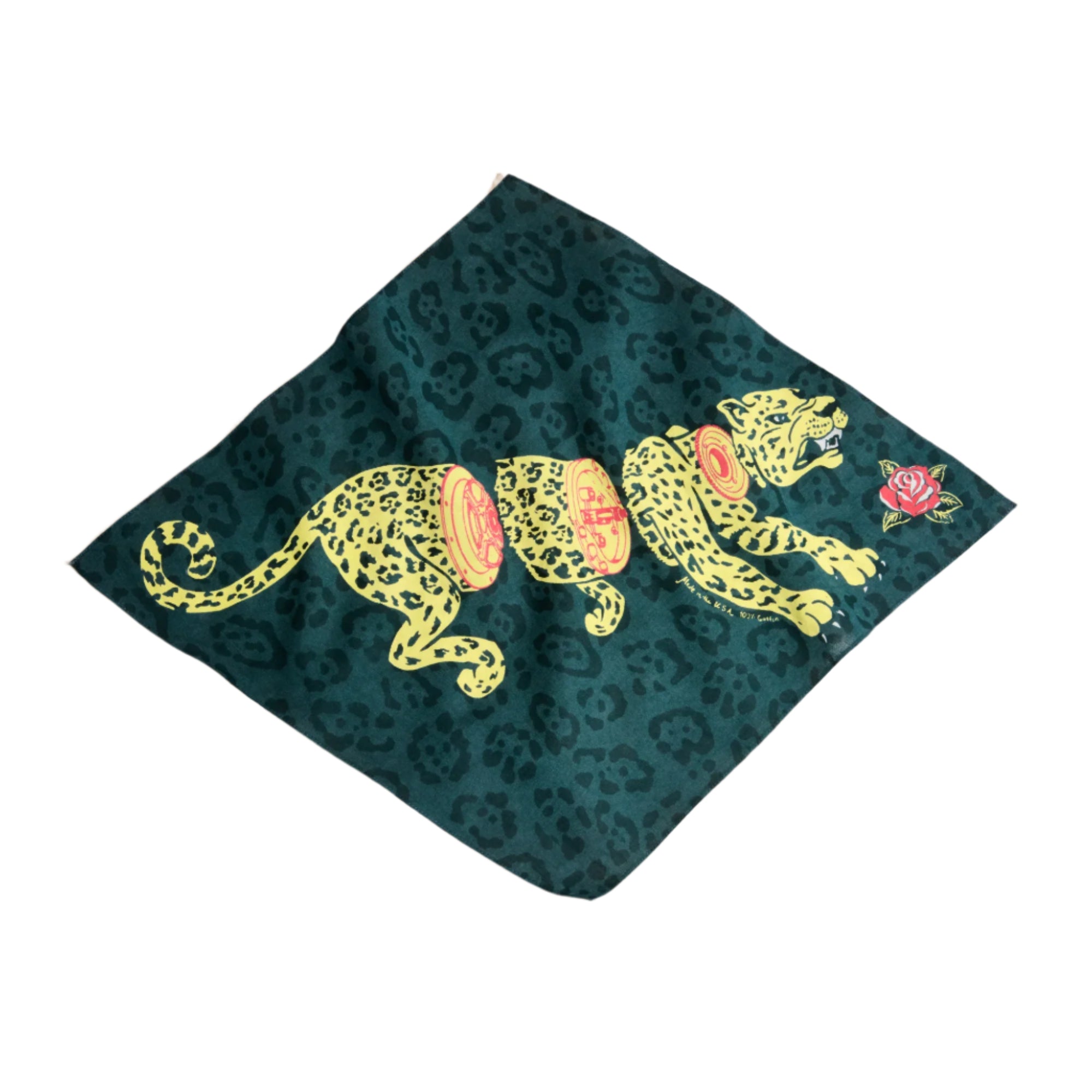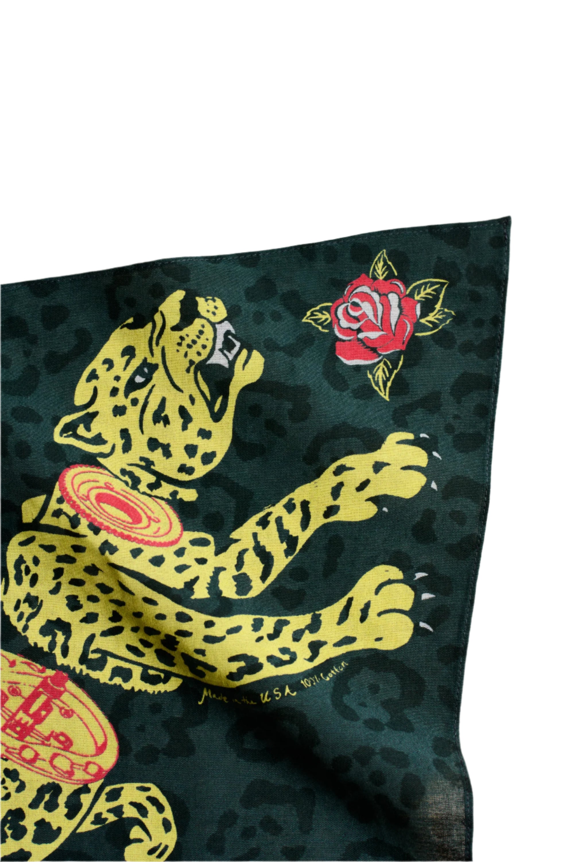 The bandana is first laser burned with the leopard print before screen printing, because two leopard prints are better than one.