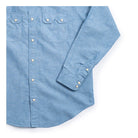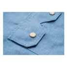 Arbeitshemd (Work Shirt). Constructed with a Raglan sleeve for extra comfort which gives the body a unique drape. Made from 145grm quality organic cotton. Chambray weave. Two roomy, one button chest pockets. Unlined, unstructured point collar. Stitch detail underneath the collar and cuffs for extra strength. Long sleeves with buttoned barrel cuffs.