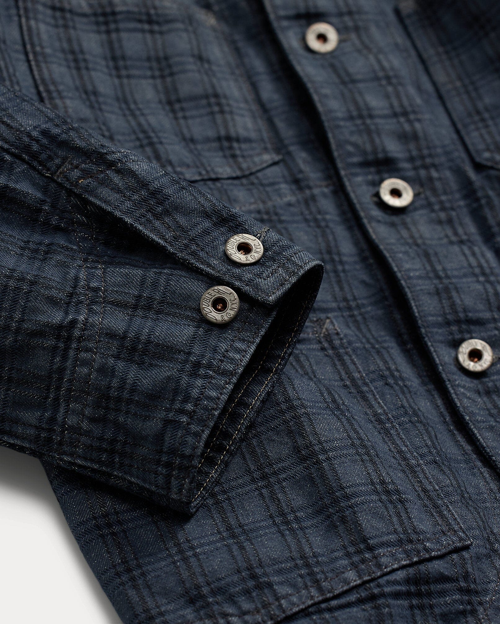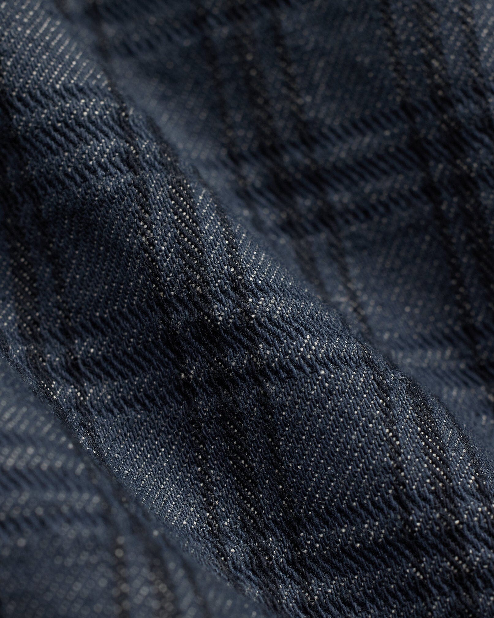 Work jacket model made with 10.9 oz. jacquard-woven denim from Japan. Yarn-dyed plaid pattern. Four pockets at the front. Unlined.