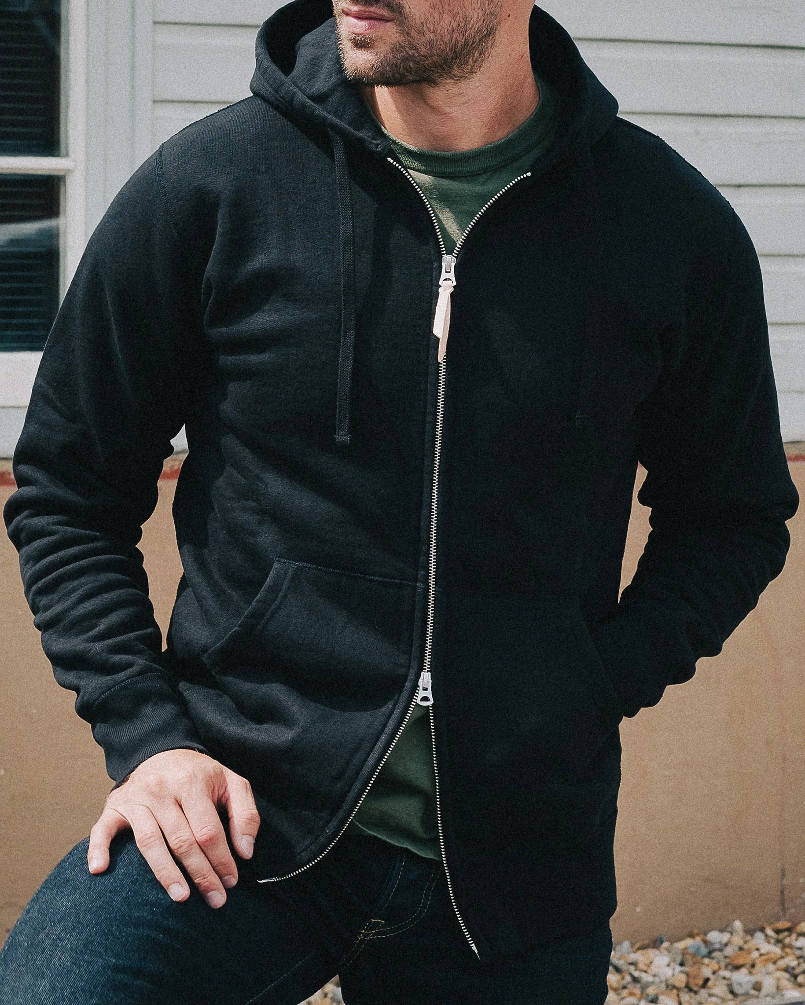 The ultra heavy loopwheel fleece we use for all of our sweatshirts is woven in Wakayama and weighs in at a massive 14oz. This Hoodie is super windproof and is constructed using four needle Union Special flat stitched seams. Finished with front pouch pockets, a 2-way Universal zipper, and adjustable hood.