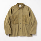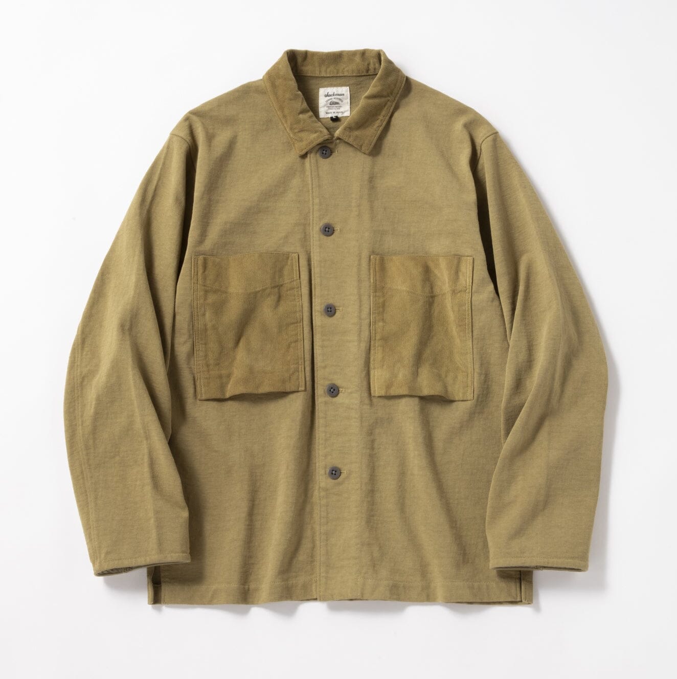 Dotsume/High-density jersey fabric is an extra-thick material of approximately 11.5 ounces, made of American cotton and knitted by loop-wheel knitting machine. As it's knitted very slowly, each knitting machine can only produce about 30 pcs per day, but it is characterized by its ability to evenly pack the yarn and its resistance to shrinkage and distortion even after repeated wear and washing. The knit has a high degree of windproofness due to its high-density knitting, and it also has the inherent warmth of knitwear. Collar and pockets are made of a different fabric, and the entire body is overdyed. Different fabrics are used for each color: Black is cotton linen weather, Blue Depths is thermal, and Moss is cotton corduroy.