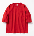 Dotsume/High-density jersey fabric is an extra-thick material of approximately 11.5 ounces, made of American cotton and knitted by loop-wheel knitting machine. As it's knitted very slowly, each knitting machine can only produce about 30 pcs for T-shirts per day, but it is characterized by its ability to evenly pack the yarn and its resistance to shrinkage and distortion even after repeated wear and washing. This T-shirt is made with ribs as thick as a sweatshirt to match the body fabric, creating a well-balanced overall look. It has the advantages of being non-transparent and sweat stains are less noticeable, and its firmness makes it less likely to cling to the skin, making it comfortable to wear. The neck is made with a binder to increase durability. Seam pocket is expertly placed on the chest.