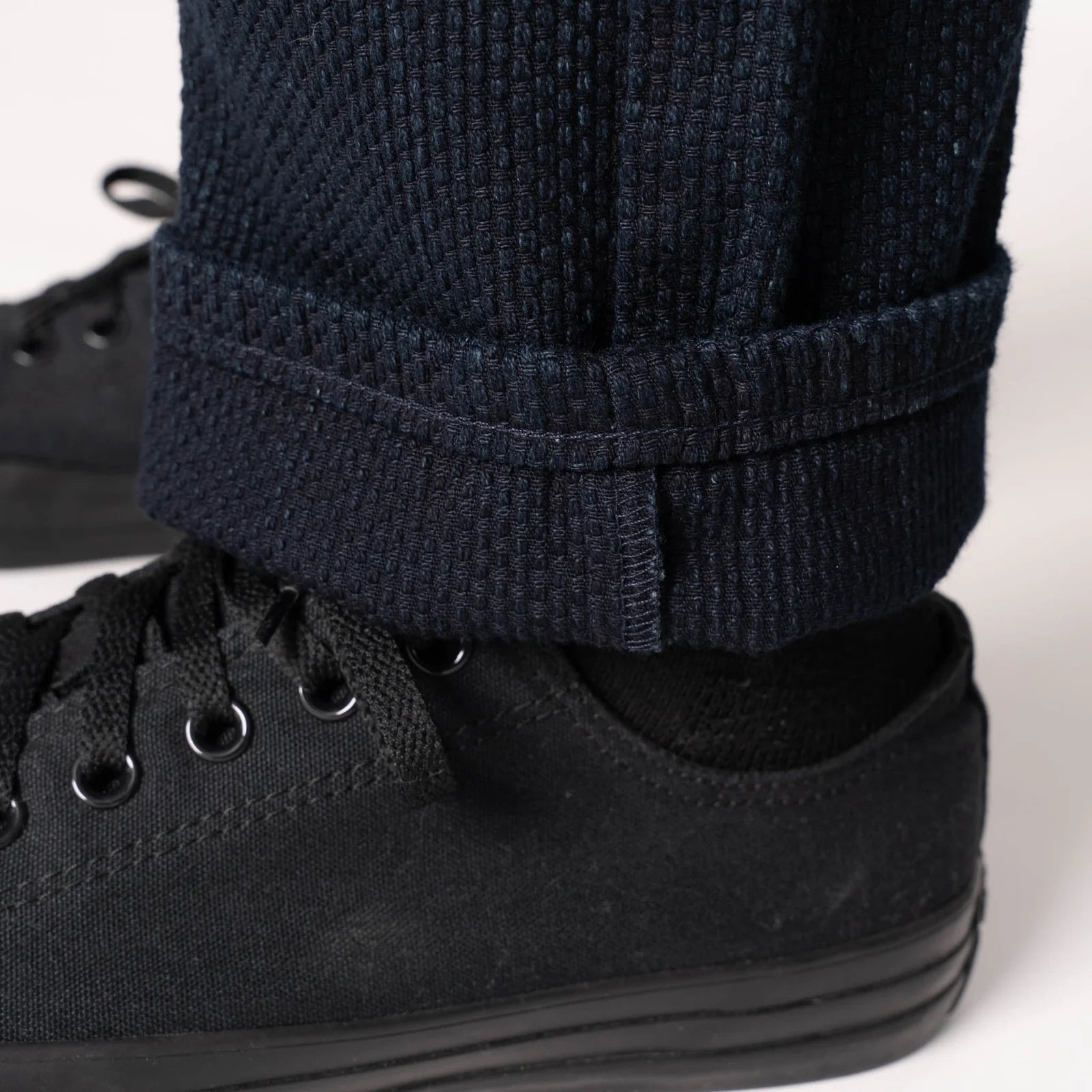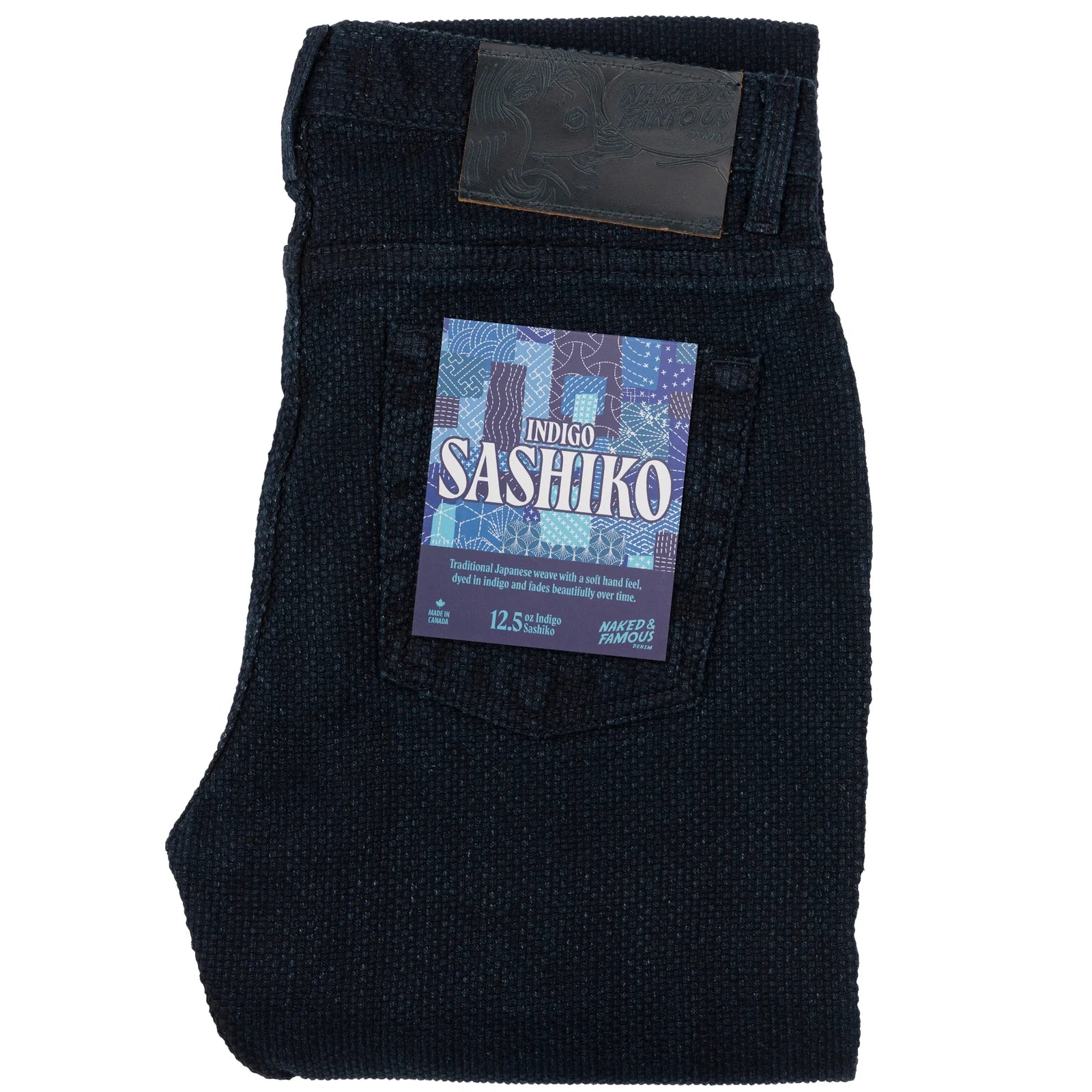Introducing the Indigo Sashiko, a 12.5oz indigo rope-dyed Japanese twill, woven with a raised running stitch pattern reminiscent of Judo uniforms. This fabric is highly textured, with the running stitches prominently raised above the base fabric. Inspired by the rigorous demands of Judo, which focuses on grabs and throws, the textured and grippy surface of this fabric provides an ideal base for indigo dye. As the raised portions of the stitches fade at slightly different rates than the base fabric, they create a beautifully nuanced fade pattern. This fabric was woven on a special jacquard loom, capable of creating complex patterns. Made from 100% cotton, this fabric offers a soft hand feel. Each pair is proudly crafted in our Canadian factory, featuring tonal stitching, a button fly, black non-reflective hardware, and a deep navy leather patch.