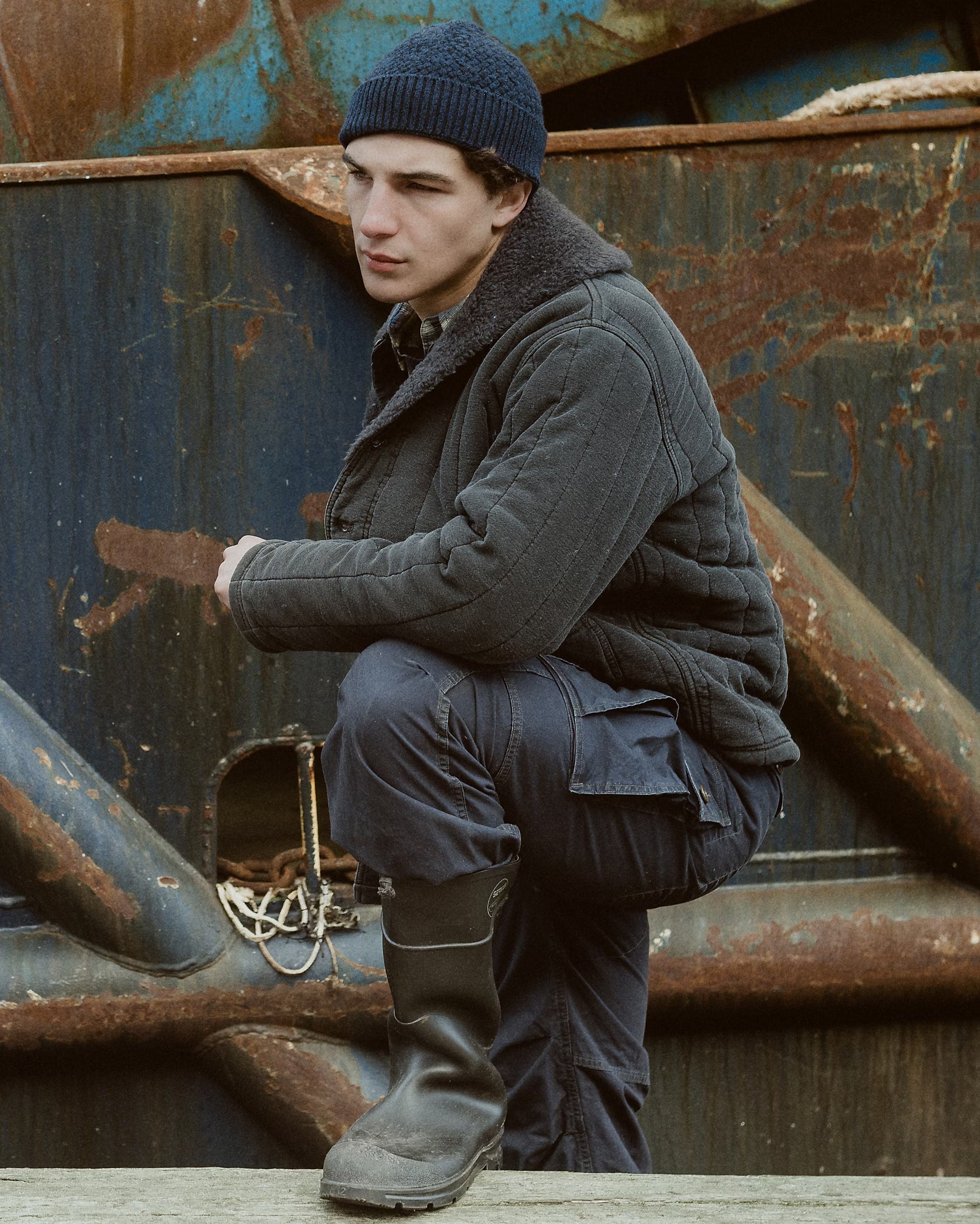Surplus-inspired jacket made with cotton jersey. High-pile wool-blend fleece shawl collar. Channel-quilted design with insulation. Indigo-dyed oxford facing at the lower placket. Self-lined. Heavily washed to create tonal dimension and a faded look. Metal buttons.