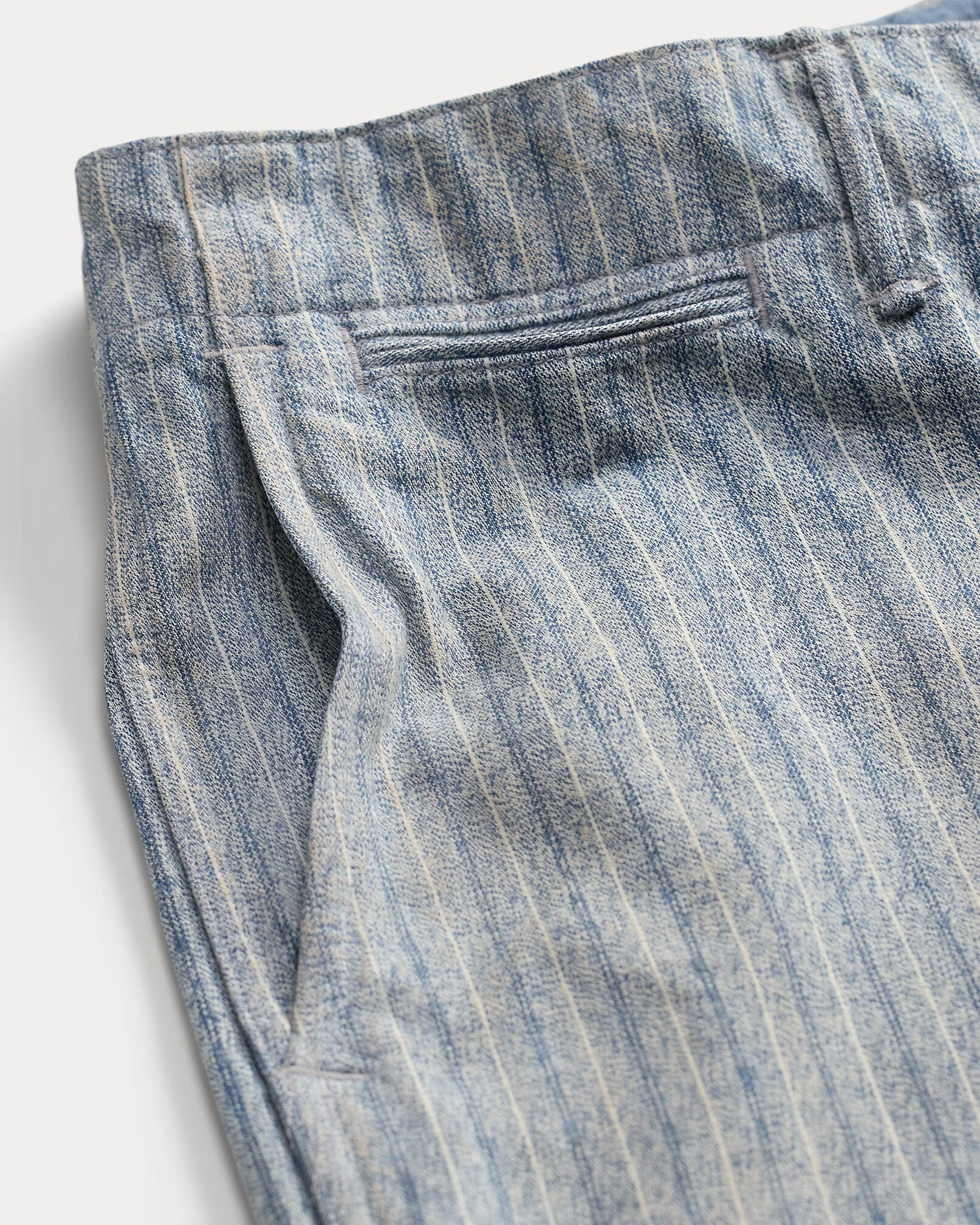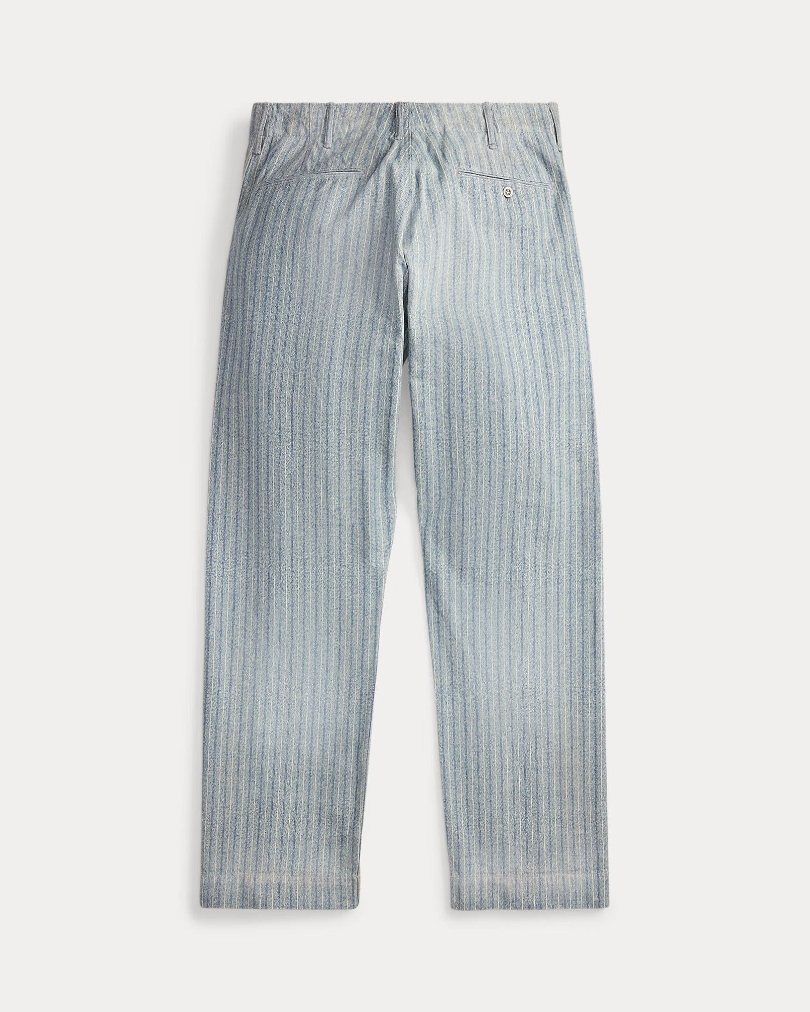 Classic-fitting pants made with 7 oz. cotton jaspé cloth. Yarn-dyed striped pattern. Inspired by field pants from the 1940s. Abraded and pigmented for a vintage, worn-in look. Metal buttons with a corroded finish.