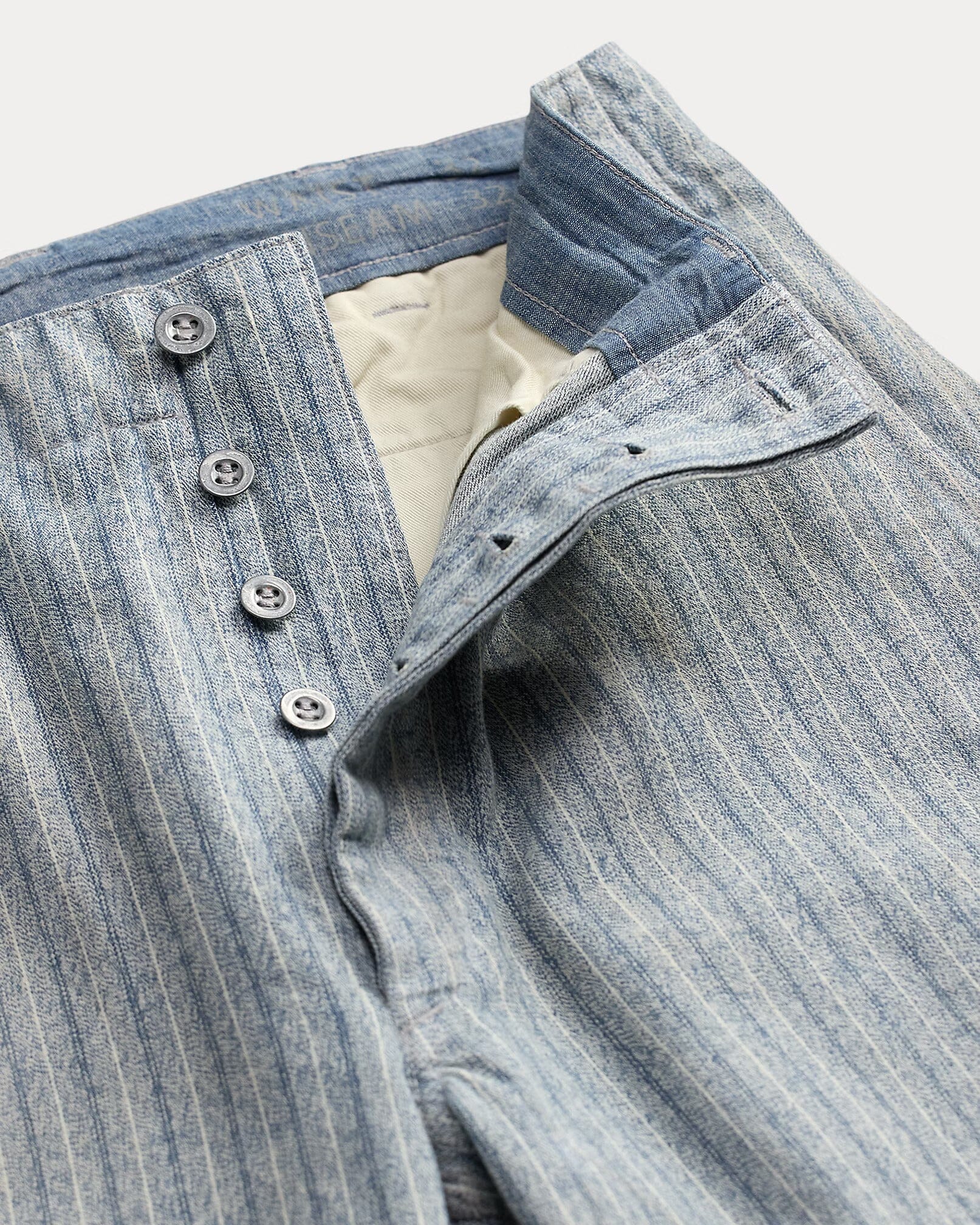 - Belt loops. Button fly with a buttoned closure. Metal buttons with a corroded finish.