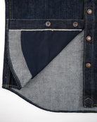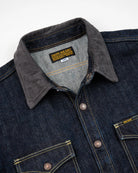 Our yokeless western CPO shirt, cut from 16oz Japanese selvedge denim and finished with a corduroy collar. Produced for Iron Heart by the centuries-old Takata Orimono mill in Kojima, this vintage-style denim is woven using pima cotton ringspun yarns, creating an uneven, slubby twill with lots of texture.