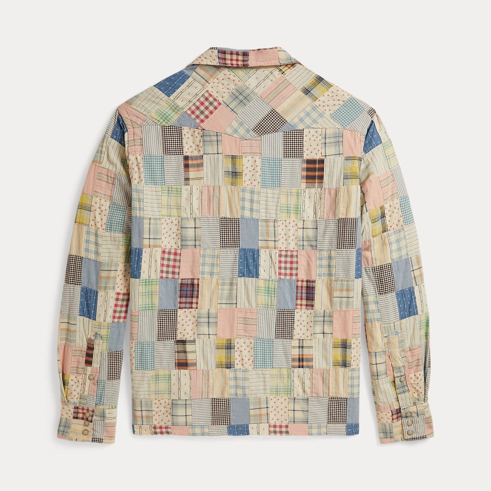 This Western camp shirt features a patchwork design that incorporates 20 different patterns—including plaids, stripes, checks, and florals—for a rustic look.