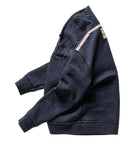 It’s all about the fabric. An all-cotton knit jacquard jersey with an insulated poly core. A material that appears quilted but without any actual stitches/quilting, more cellular in the way that the individual insulated cores are formed. The result is an incredibly warm and comfortable garment that’s very durable and can stretch with one’s movement.