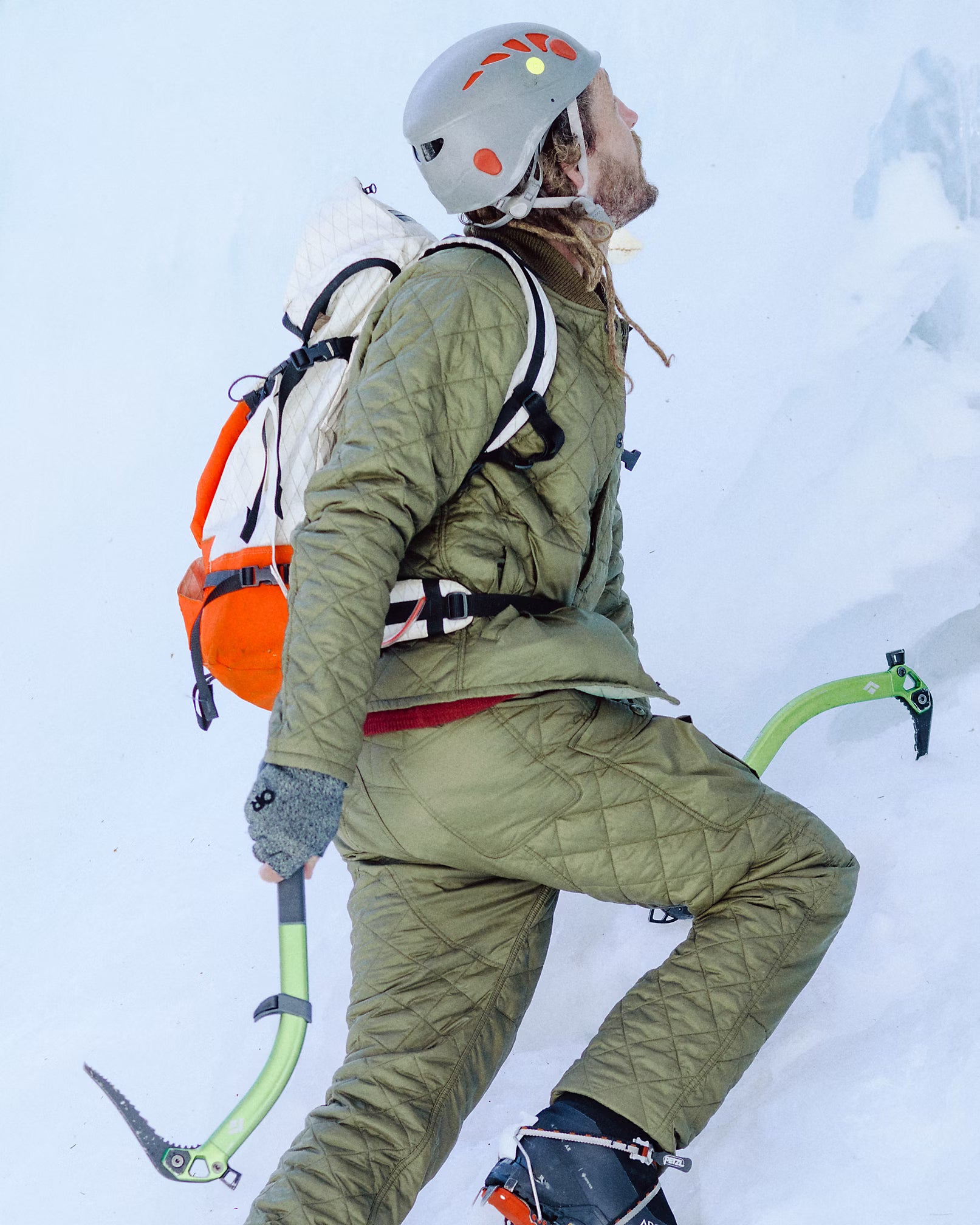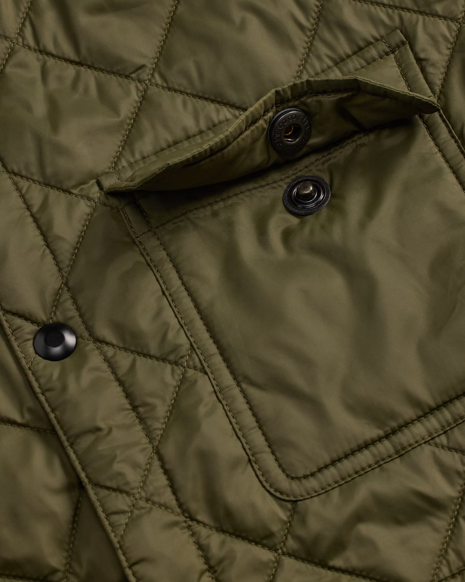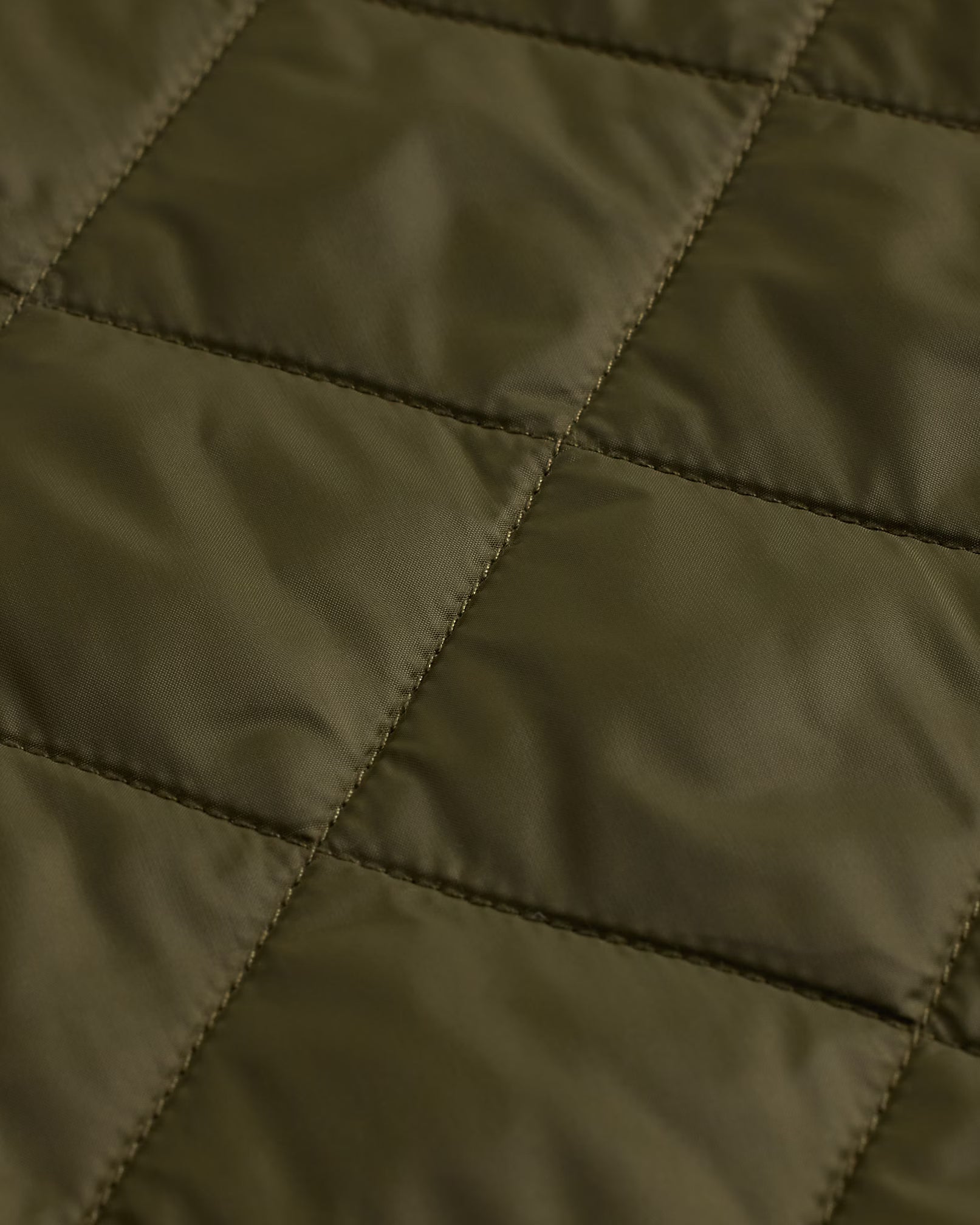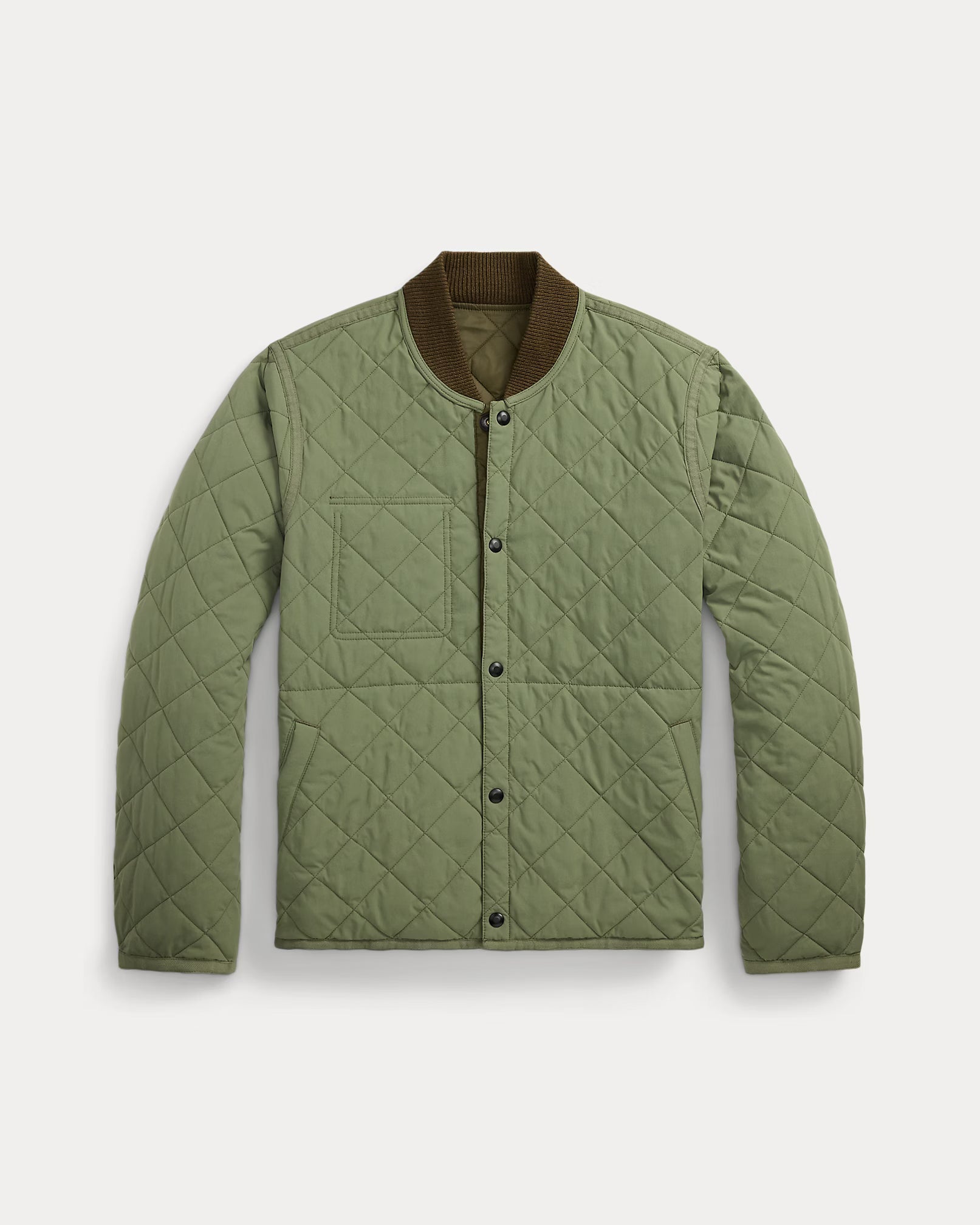 Reversible liner jacket. Olive-hued shell is quilted at the top half. Sage-hued reverse is fully quilted with tonal herringbone taping. Ribbed baseball collar. Lightweight diamond-quilted construction. Chamois lining at the waist pockets.