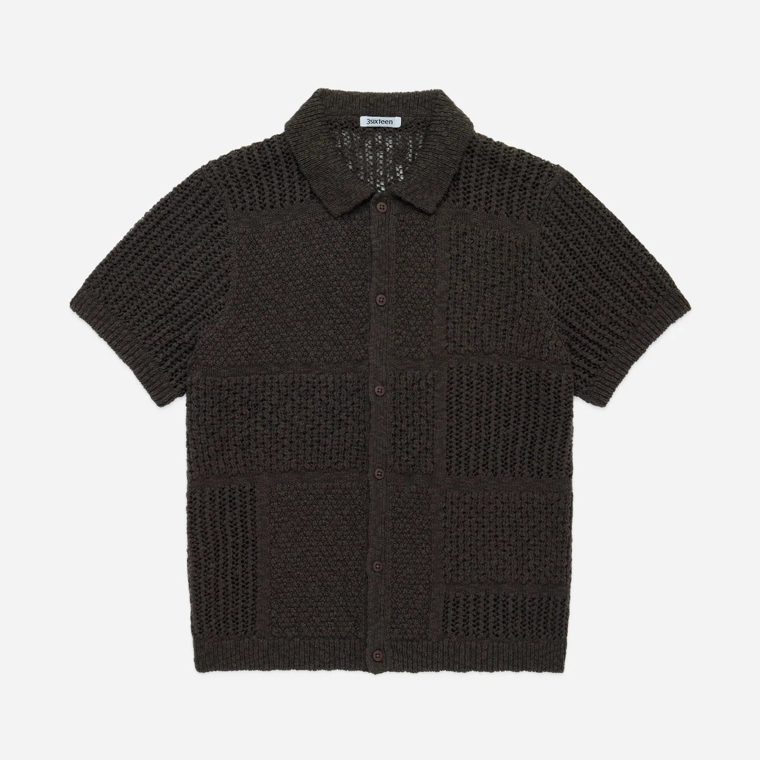 With a button front placket, collar, and open cuffs, it functions as a shirt but is knit in a soft and comfortable pima cotton. For SS26, 3sixteen knit a paneled and blocked pattern that's reminiscent of paintings from the De Stijl movement.
