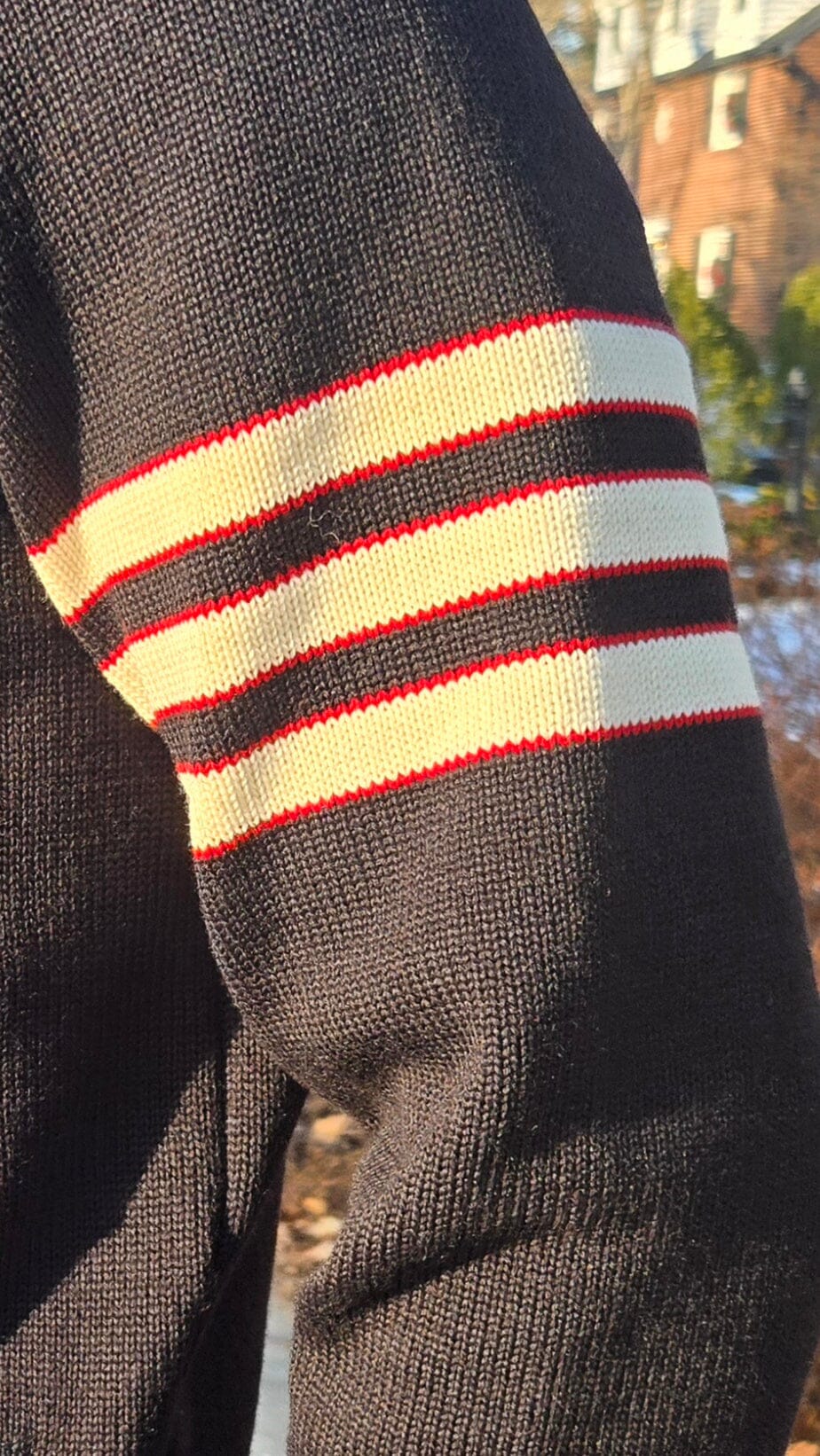 • 3 solid Varsity Off-White sleeve stripes w/Scarlet feathering