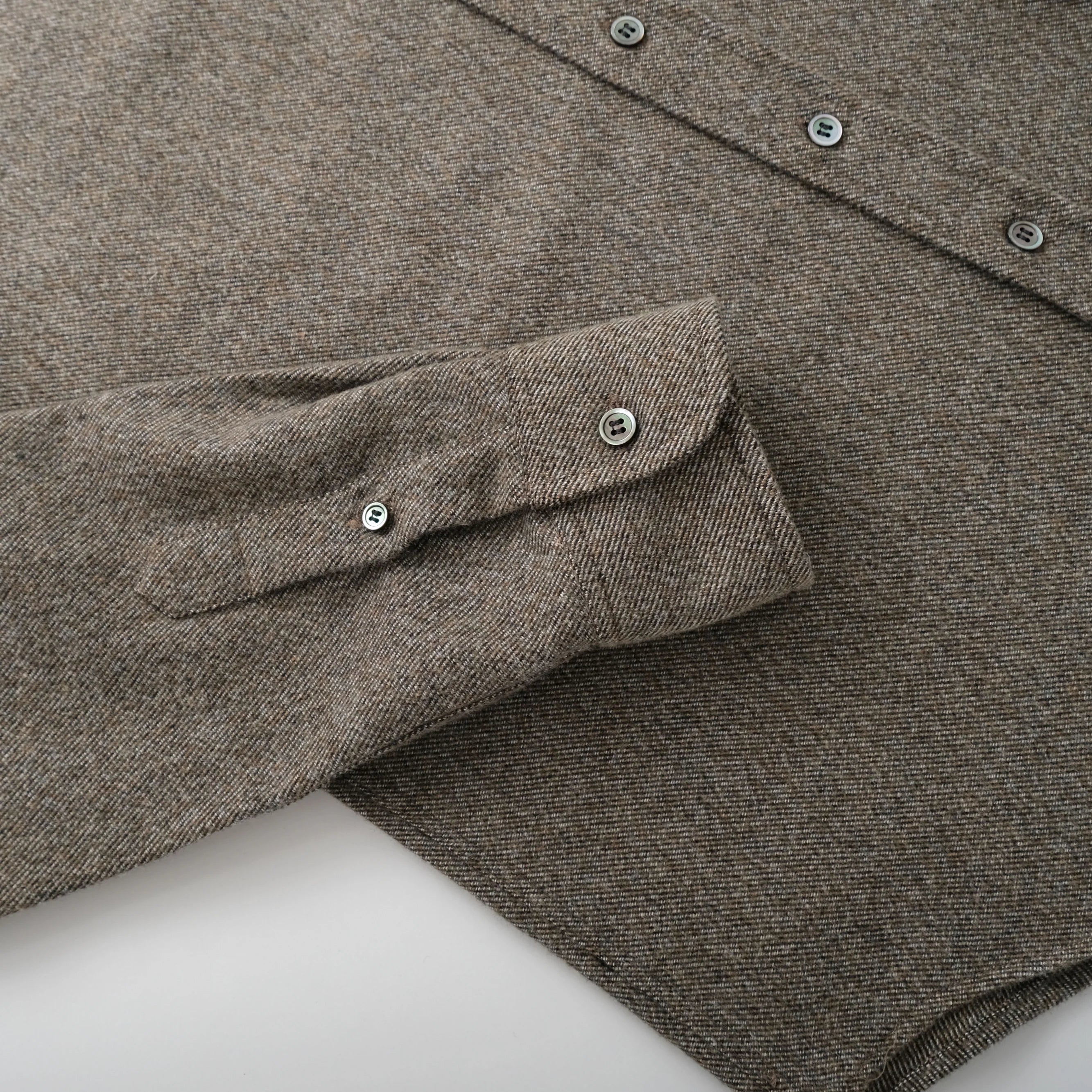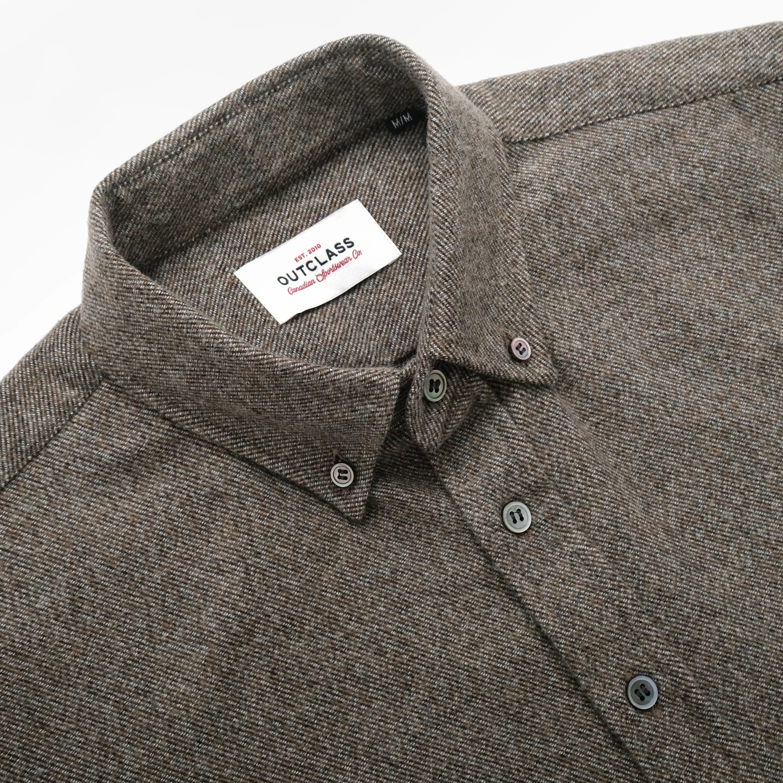 The Moss Twill Flannel Shirt is made with an ultra-soft flannel fabric from Portugal. The shirt sports a relaxed fit, button-down collar and grey mother of pearl buttons.