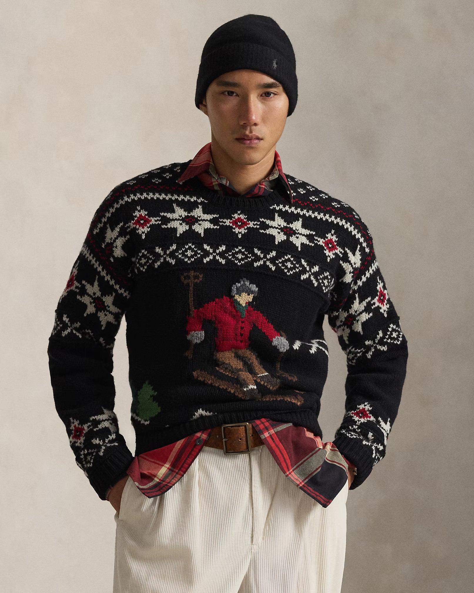 Part of the season’s collection inspired by outdoor exploration and adventure, this sweater utilizes 13 wool yarns to depict a skier descending snowy slopes. It draws inspiration from vintage Ralph Lauren knitwear, including a sweater that was featured in an iconic Polo ad from the ’80s.