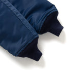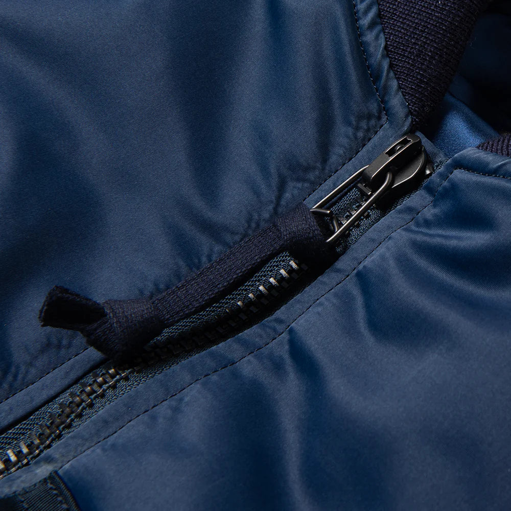 This indigo MA-1 jacket showcases 100% nylon fabric treated with indigo pigment, creating distinctive texture variations and natural creasing that distinguish it from conventional nylon. The irregular surface characteristics are inherent to the indigo dyeing process, lending authentic character to each piece. Constructed at a heritage factory renowned for crafting military souvenir jackets since the post-WWII era, the jacket features circular knit ribbing for refined comfort and durability. Note that color variation is inherent to the dyeing method, and the indigo may transfer onto lighter garments during wear.