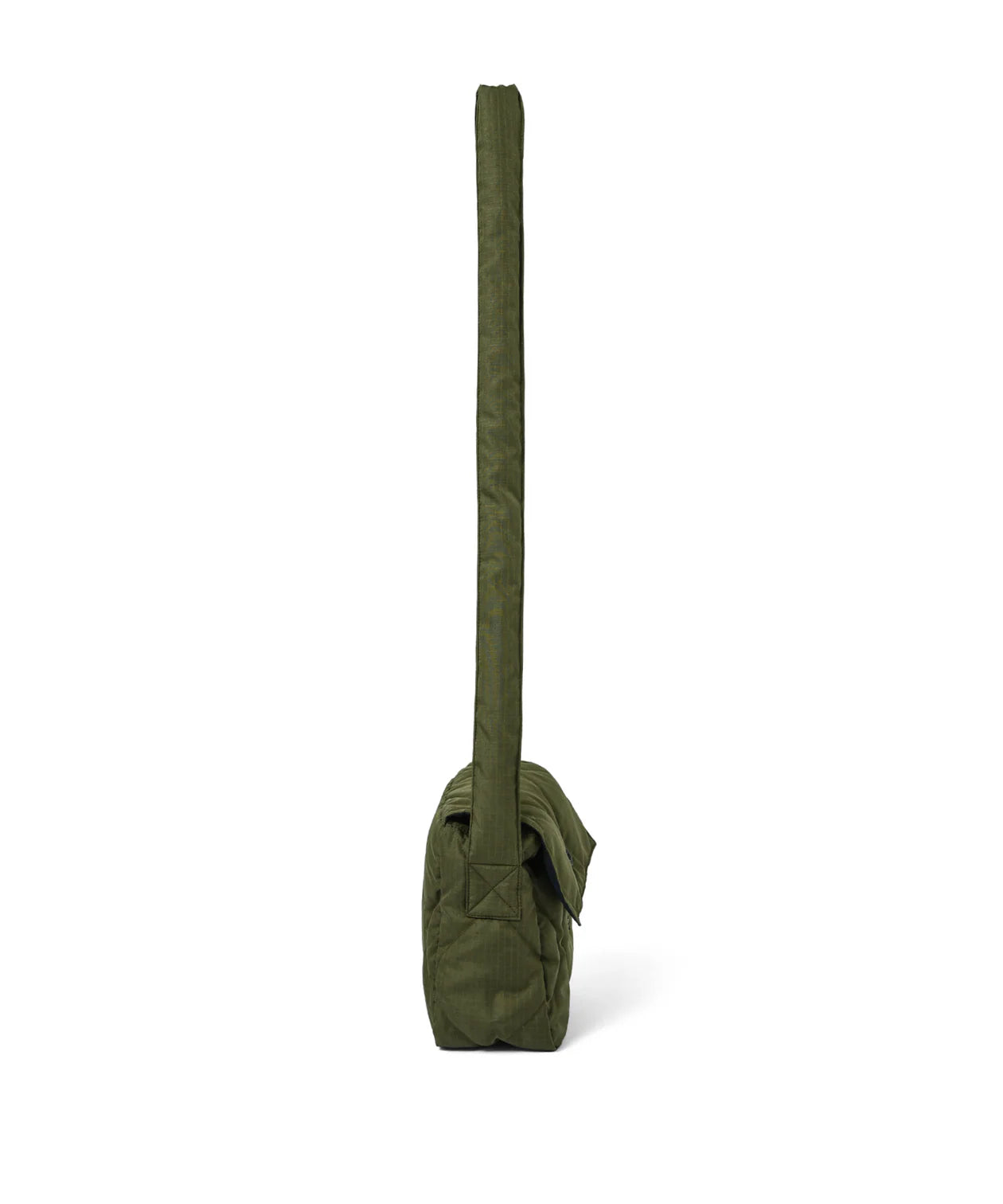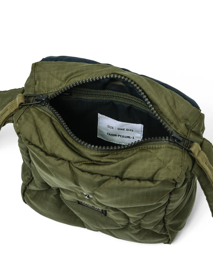 This military-inspired mini shoulder down pouch is your perfect companion for city walks or travel adventures. Designed to be just the right size for your essentials, this pouch can comfortably fit your smartphone, wallet, keys, and other small items. It's crafted with durable ripstop fabric and filled with premium 800-fill-power down, giving it a unique three-dimensional shape and an incredibly lightweight feel. The loofah-style quilting adds a touch of tactical style. This blend of form and function makes it an ideal everyday accessory or a convenient secondary bag for your travels.