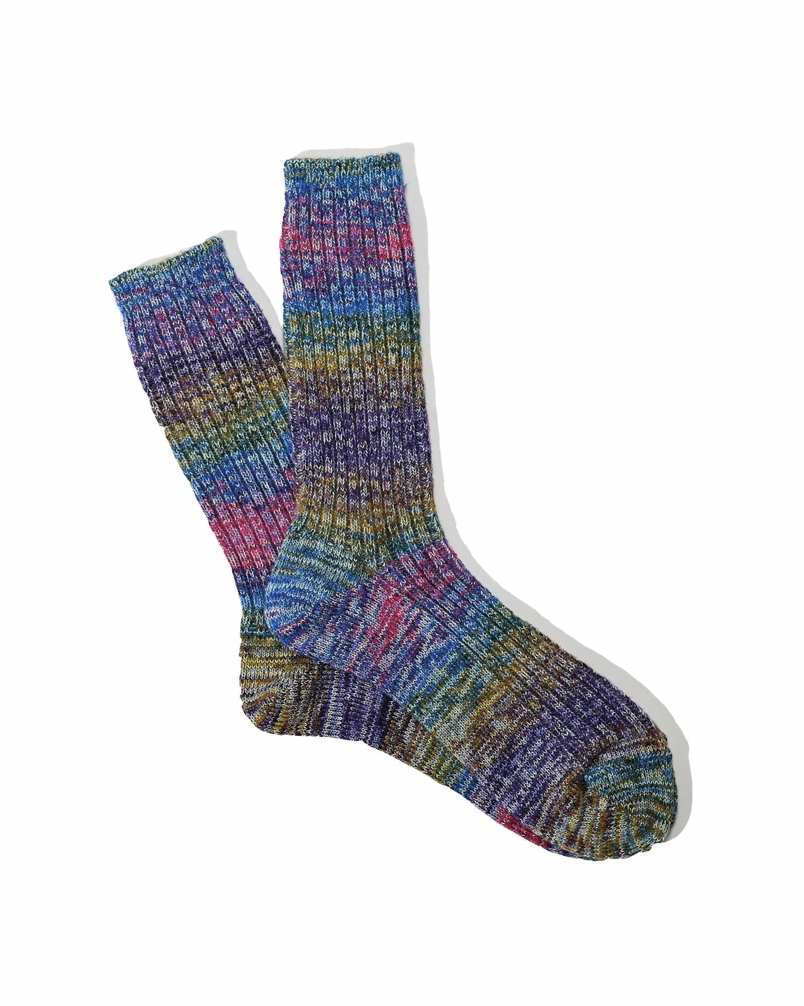 Introducing the Splash Pattern Crew, a staple for the autumn and winter seasons. Each year, this design is updated by blending different yarns, giving it a fresh look. This season, we've shifted from traditional hemp to vibrant combed cotton, enhancing the richness of its colors. The unique kasuri-dyed yarn creates an asymmetric design, making each pair one-of-a-kind, like a tie-dye masterpiece. Enjoy the individuality of every sock!