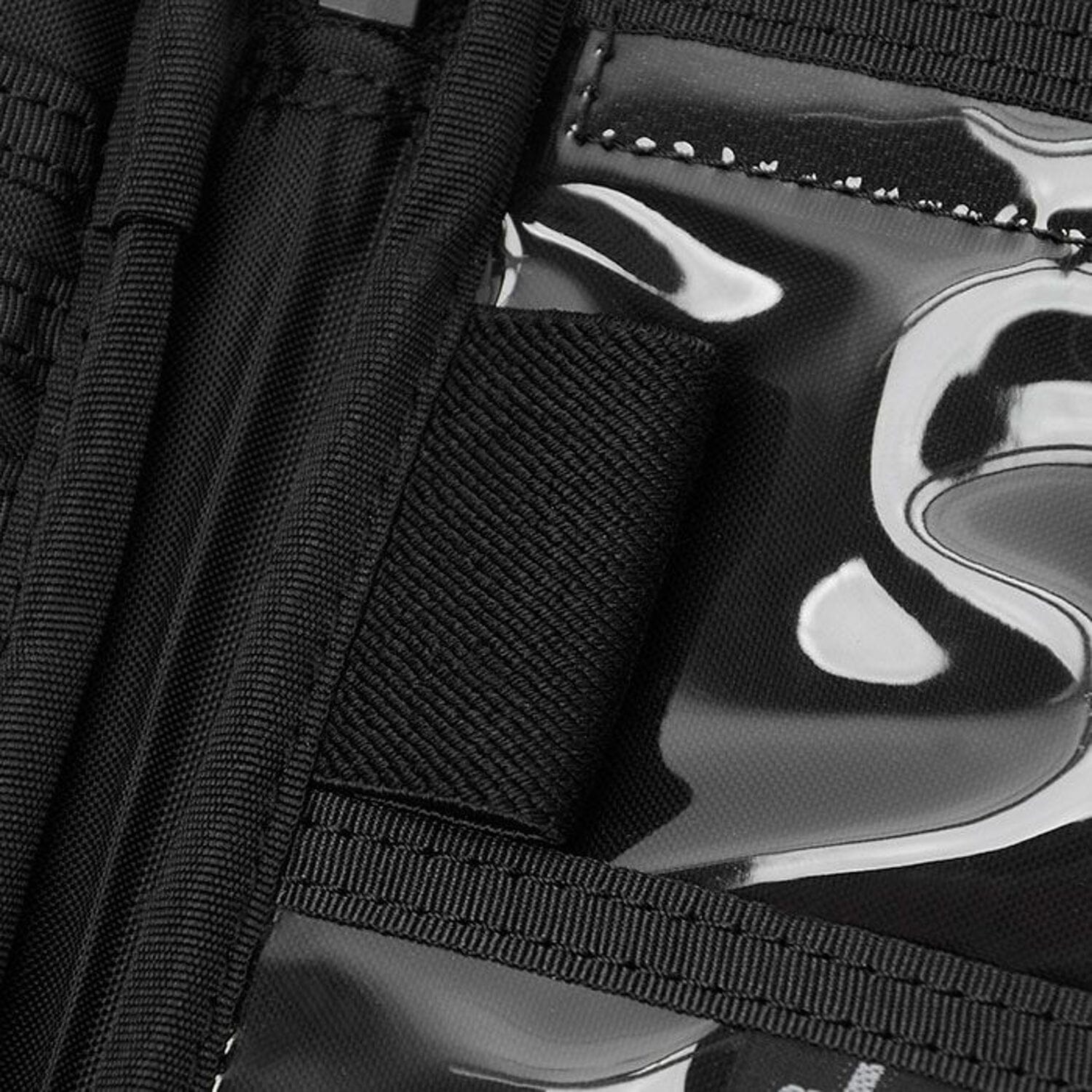 The 1000 denier Cordura nylon, which is very strong and lightweight, has a twisted polyester called X-PLY on the back side, which is placed in a bias (diagonal to the fabric) direction to suppress the diagonal stretch, which is a weakness of woven fabrics. Furthermore, a very thin PET film, also made of polyester, is laminated (pressed) using a patented method to seal the weave of the fabric, preventing the intrusion of rain, sweat, and other water. This material is strong, lightweight, and waterproof. The gusset part is made of fabric that does not include the X-PLY of X-C1000, in order to keep the shape of the bag beautiful.