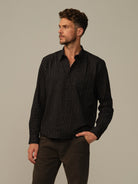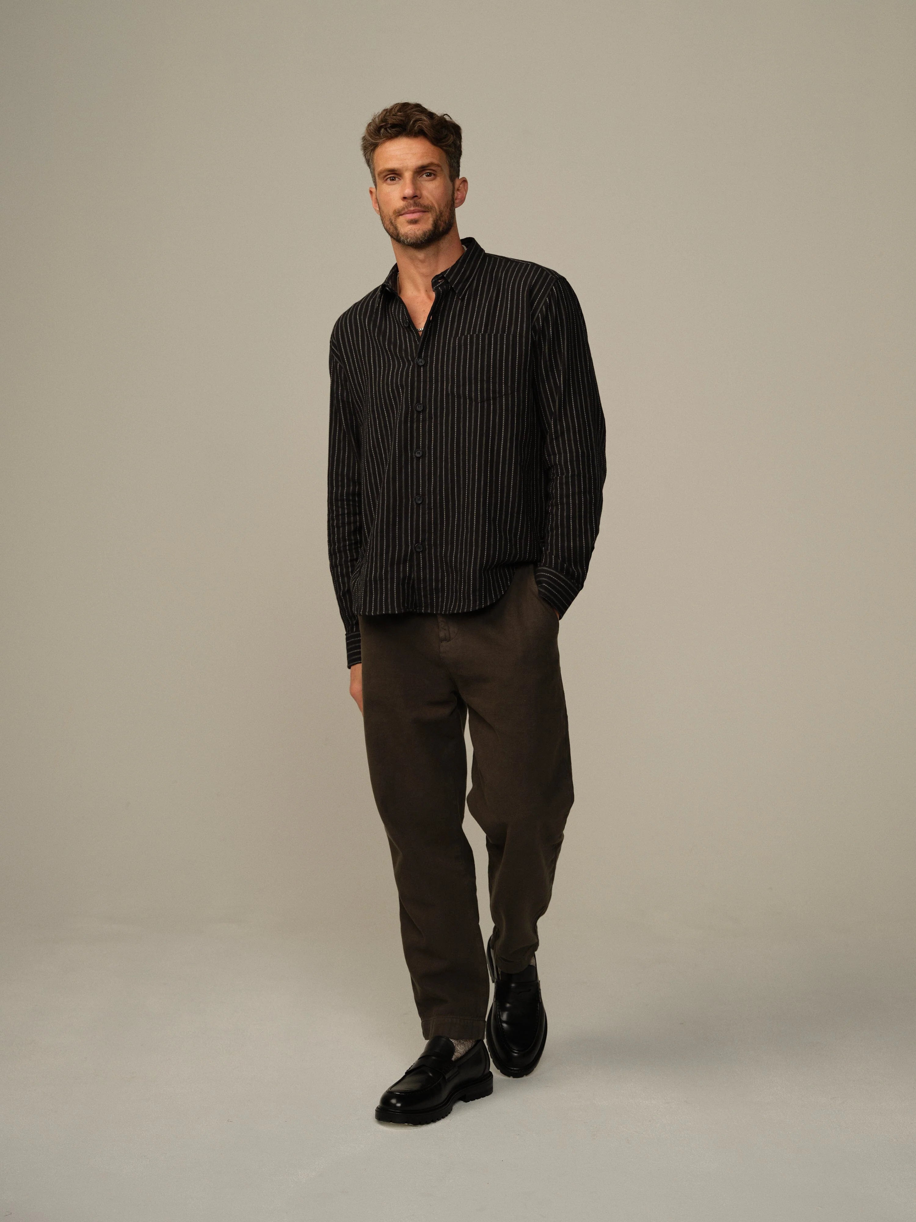 Elevate your style and your conscience with the Road To Nowhere - Accord Japanese Organic Cotton Shirt in Black Stripe. Made from ethically-sourced, soft organic cotton, this classic shirt features a sleek black stripe design. You'll look and feel great knowing you're wearing a sustainably-made, high-quality garment. Stride confidently towards a brighter future.